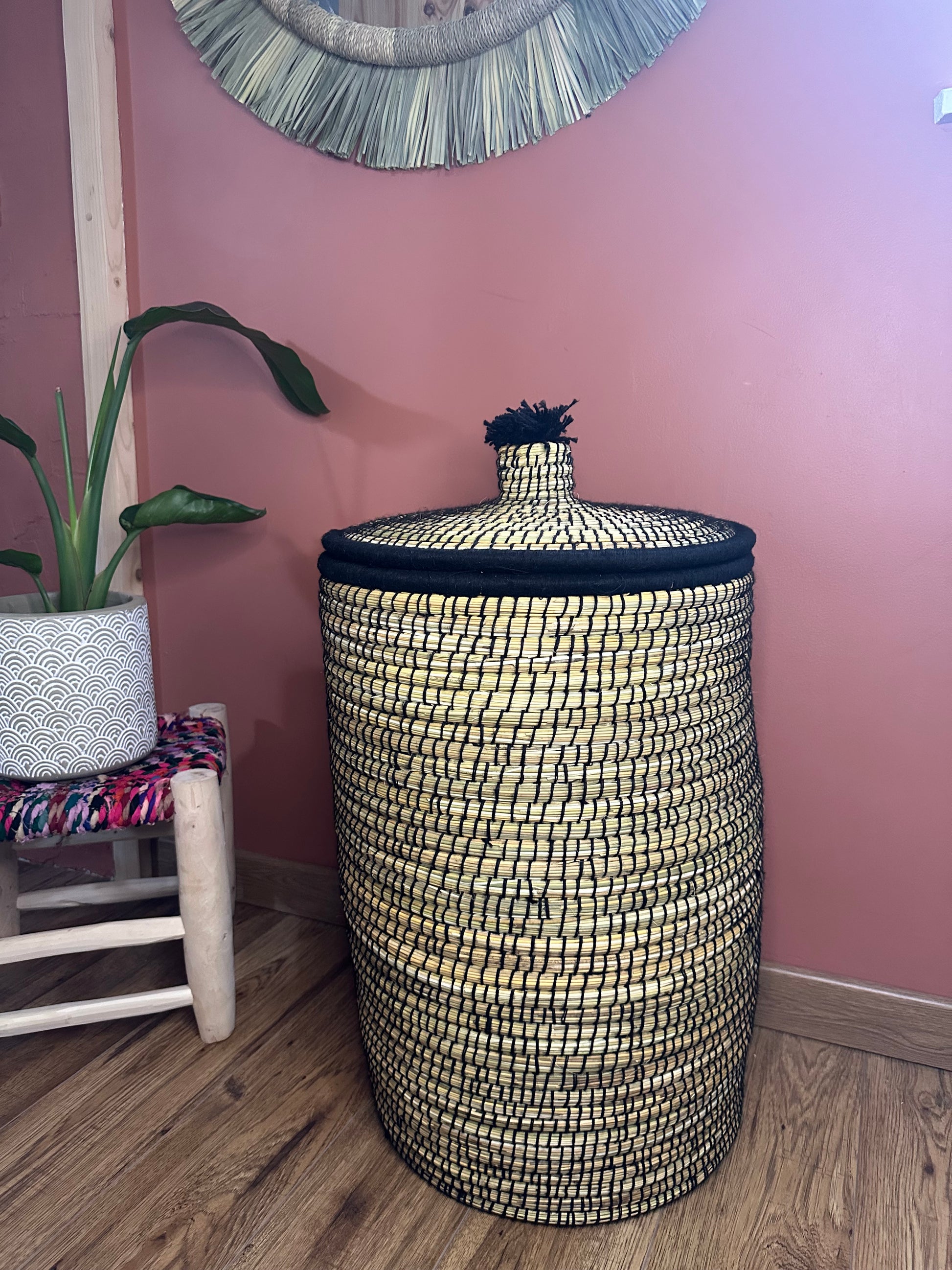 Avec sa forme généreuse et son couvercle orné d’un pompon noir, il s’adapte à tous les intérieurs : bohème, ethnique, moderne ou minimaliste.