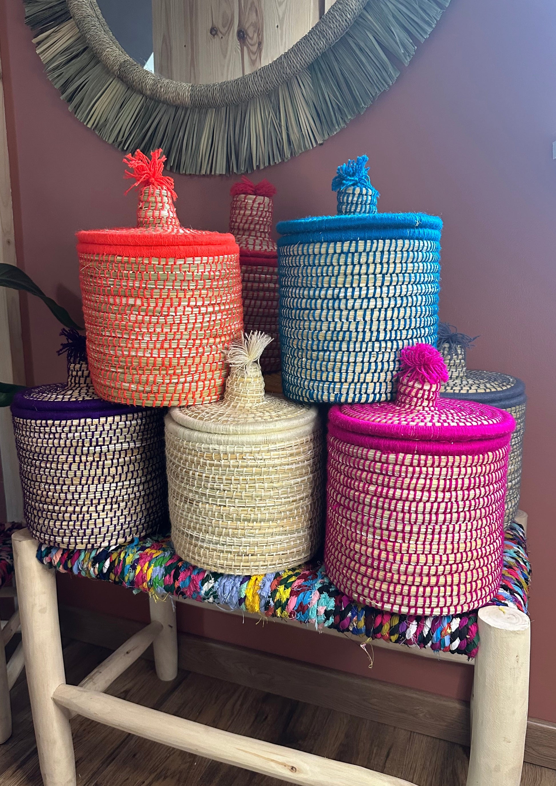 Chaque pièce est unique, fabriquée à partir de jonc naturel et de laine artisanale soigneusement teintée, pour un rendu à la fois chaleureux, authentique et plein de caractère.