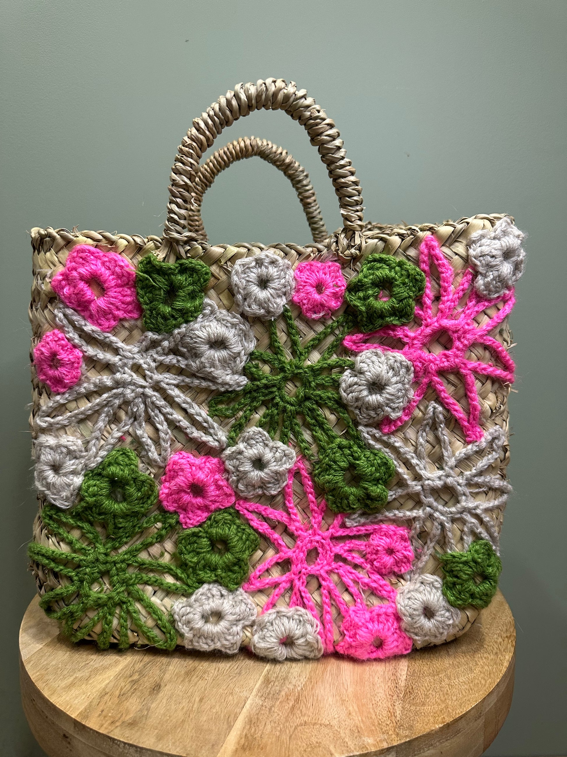 Matière : Feuille de palmier tressée + broderie crochetée en laine