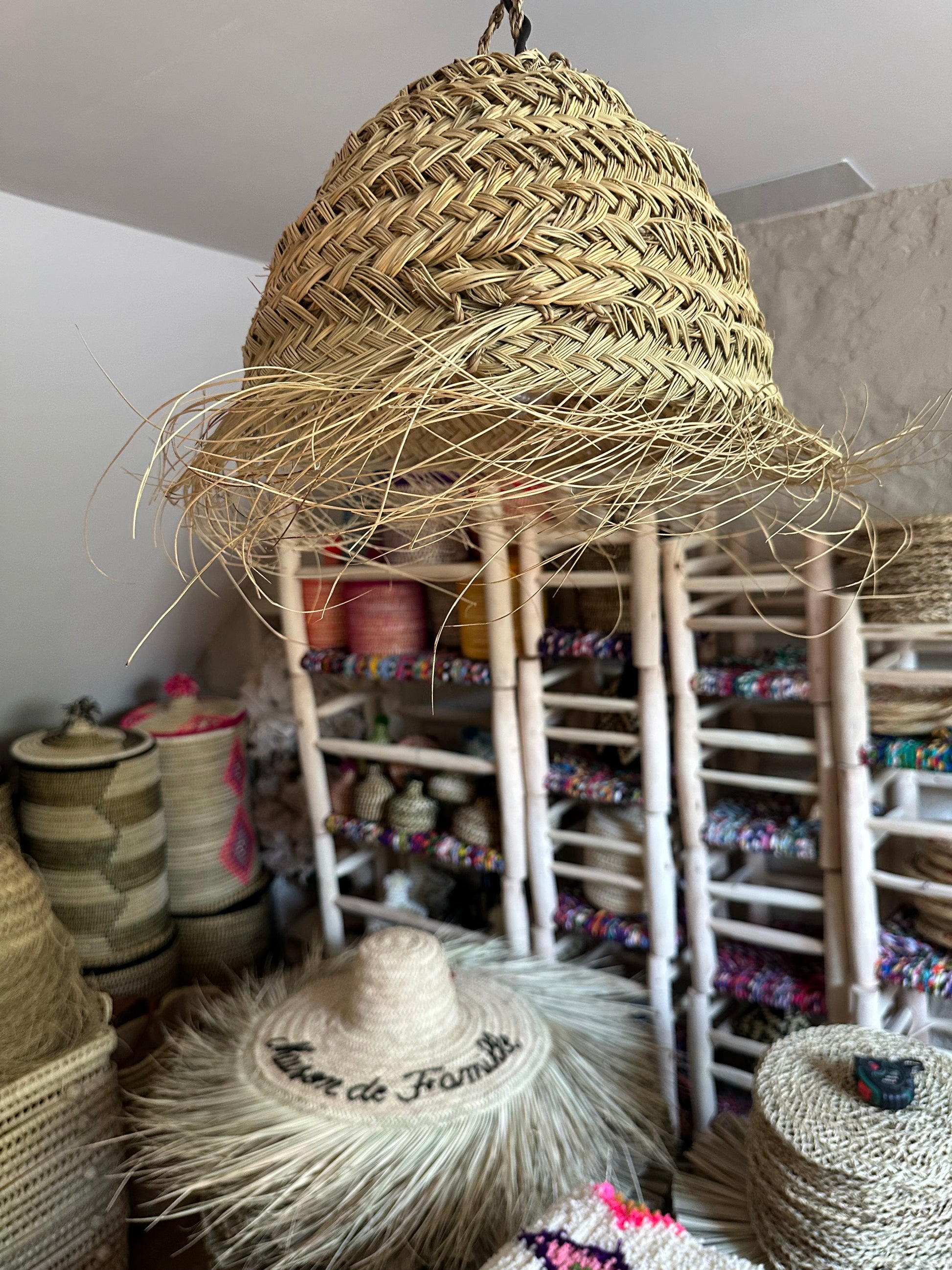 Cette suspension artisanale est entièrement tressée à la main à partir de feuilles de palmier naturelles par des artisans marocains au savoir-faire ancestral.
