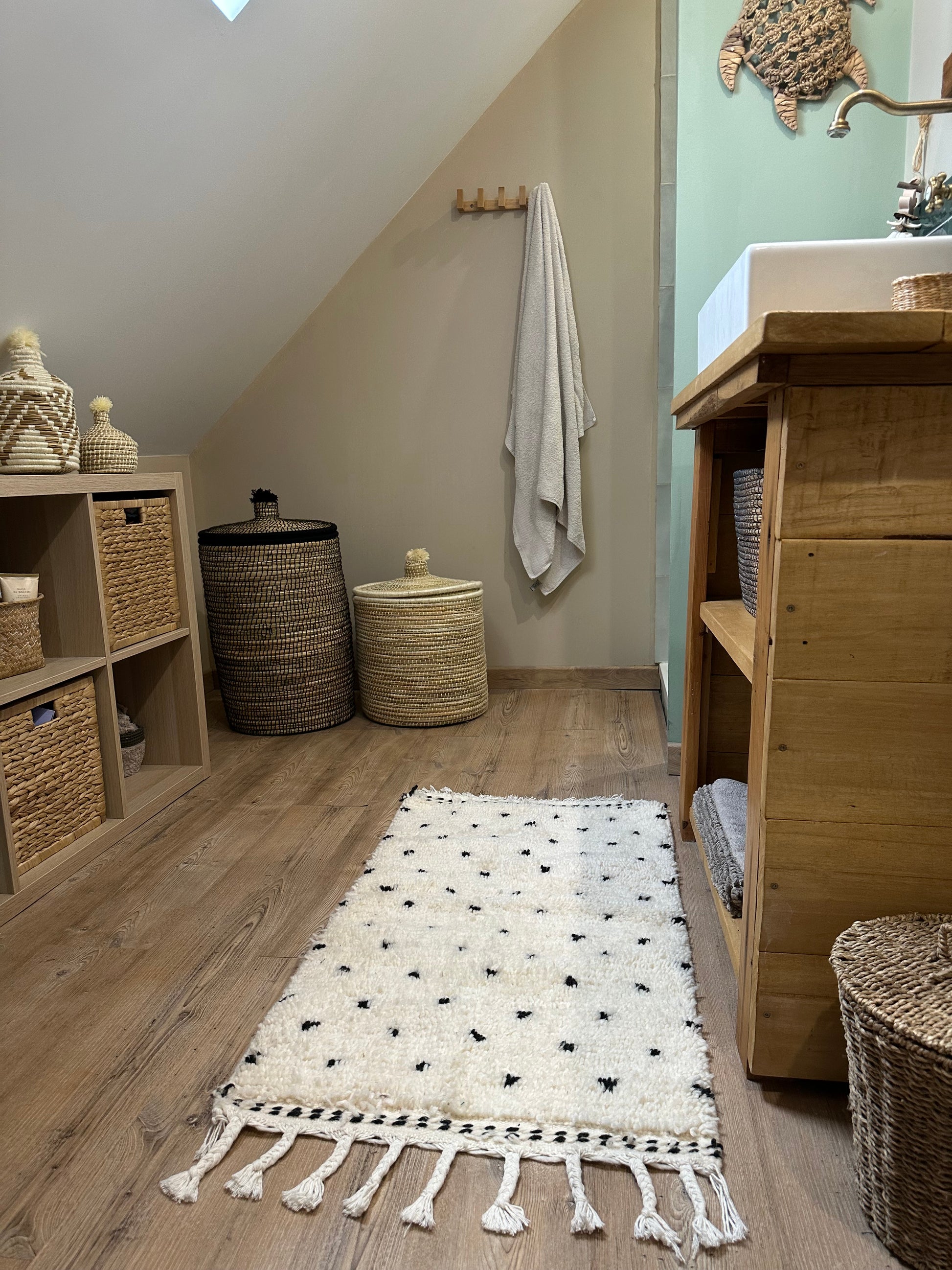 Avec son fond écru naturel et ses petits pois noirs, ce modèle minimaliste et intemporel s’intègre parfaitement dans une salle de bain, une chambre ou un coin lecture. Sa taille compacte en fait un tapis descente de lit idéal ou un tapis d’appoint pratique et chic.