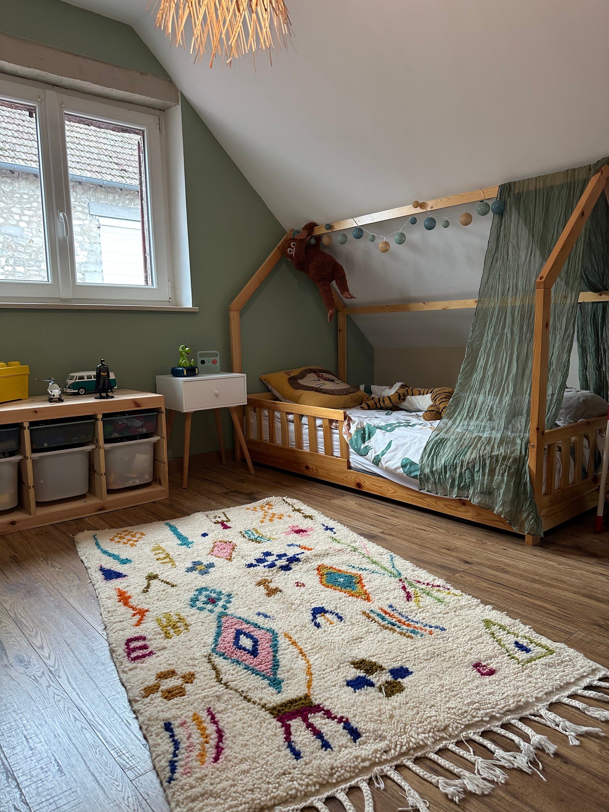Réalisé en 100 % laine de mouton naturelle, il séduit par sa texture épaisse, son toucher doux et ses motifs colorés et joyeux.